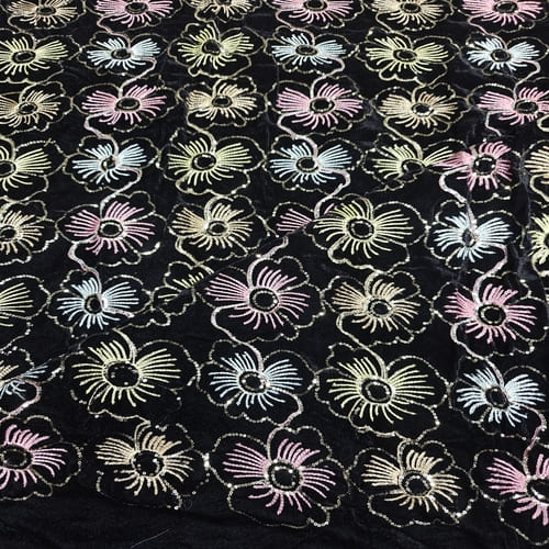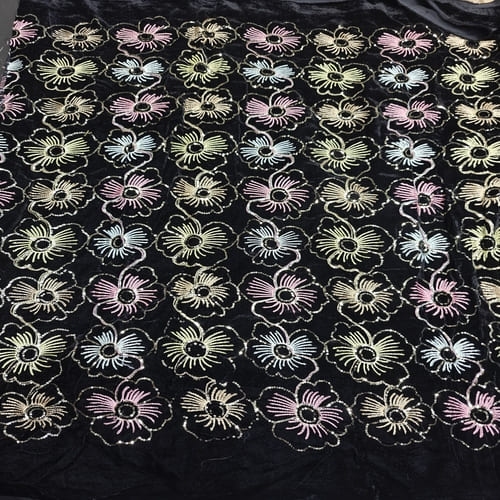 Black  Embroidered Velvet Fabric with Multi Thread Embroidery and mirror work done all over the fabric. This Fabric is very Flowy and can be used to make trendy Dresses. Do Browse our other collections of Embroidered Fabrics
