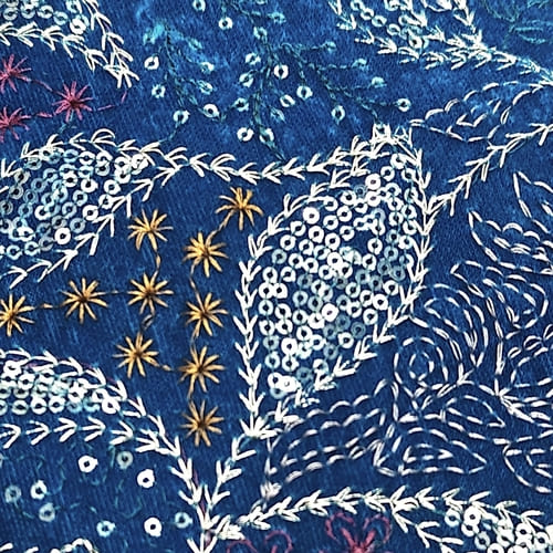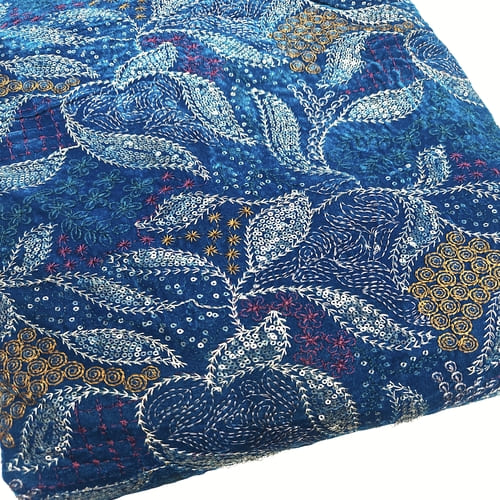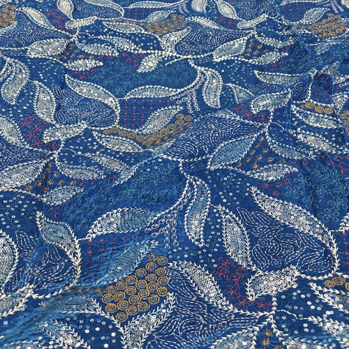 Blue Embroidered Velvet Fabric with Multi Thread Embroidery and mirror work done all over the fabric. This Fabric is very Flowy and can be used to make trendy Dresses. Do Browse our other collections of Embroidered Fabrics