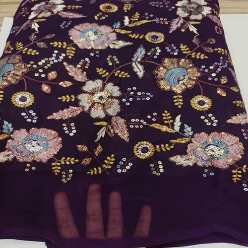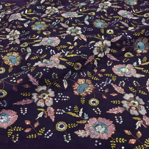 Dark Purple Embroidered Georgette Fabric with Multi Thread Embroidery and mirror work done all over the fabric. This Fabric is very Flowy and can be used to make trendy Dresses. Do Browse our other collections of Embroidered Fabrics