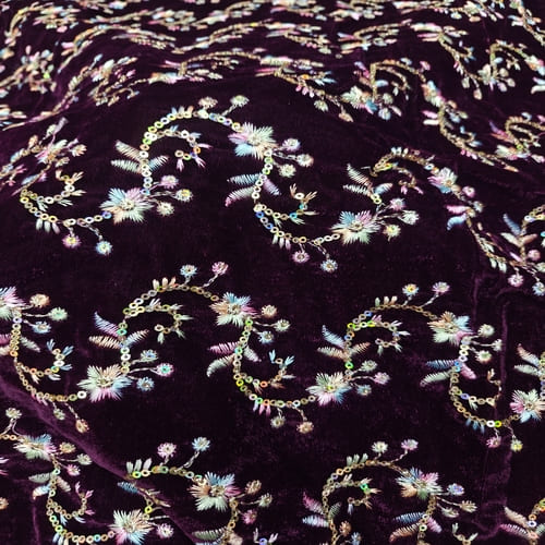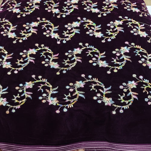 Dark Wine Embroidered Velvet Fabric with Multi Thread Embroidery and mirror work done all over the fabric. This Fabric is very Flowy and can be used to make trendy Dresses. Do Browse our other collections of Embroidered Fabrics