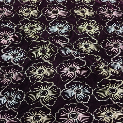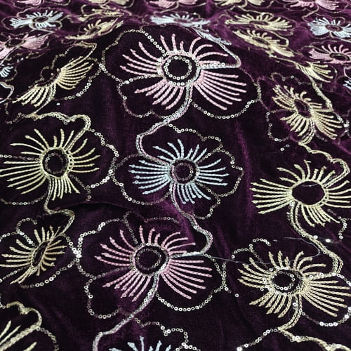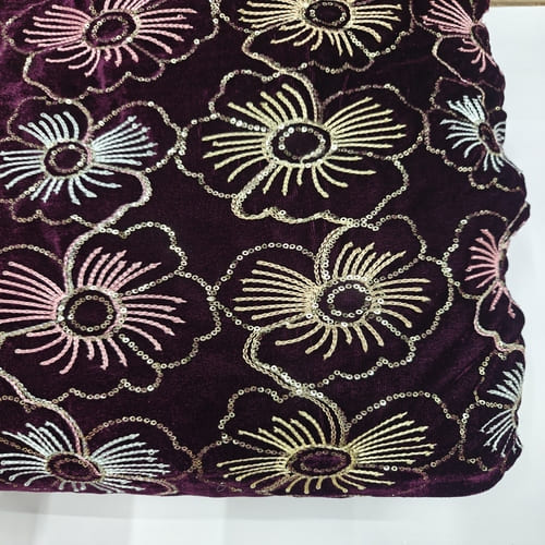 Dark Wine Embroidered Velvet Fabric with Multi Thread Embroidery and mirror work done all over the fabric. This Fabric is very Flowy and can be used to make trendy Dresses. Do Browse our other collections of Embroidered Fabrics