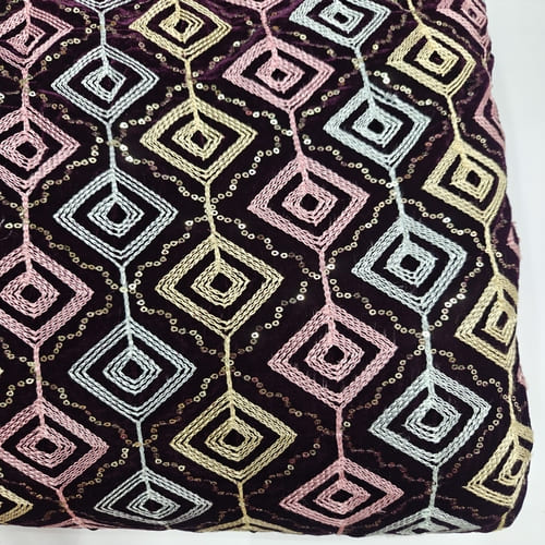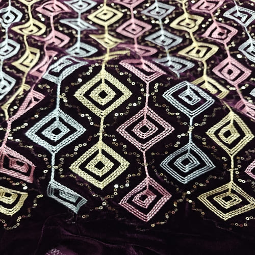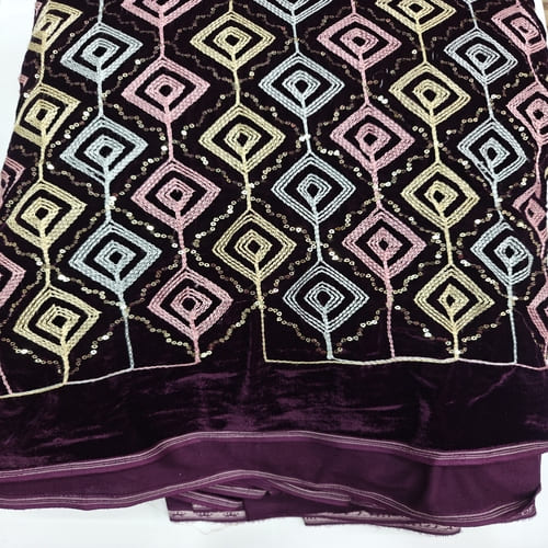 Dark Wine Embroidered Velvet Fabric with Multi Thread Embroidery and mirror work done all over the fabric. This Fabric is very Flowy and can be used to make trendy Dresses. Do Browse our other collections of Embroidered Fabrics