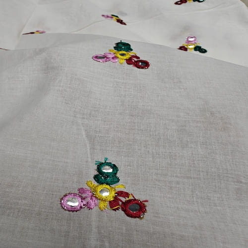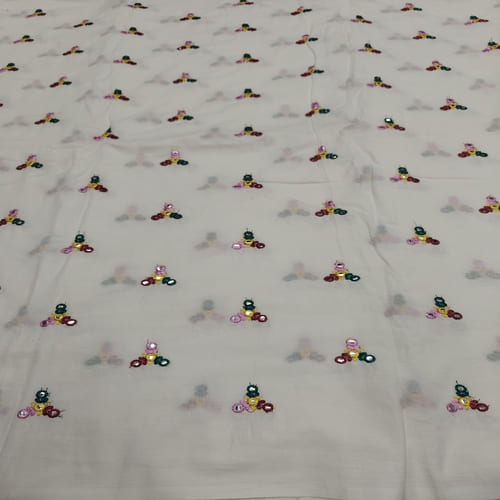 Dull White Embroidered Cotton Fabric with Multi Thread Embroidery and mirror work done all over the fabric. This Fabric is very Flowy and can be used to make trendy Dresses. Do Browse our other collections of Embroidered Fabrics