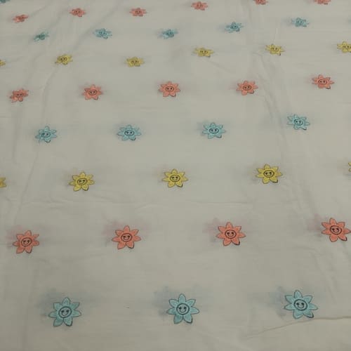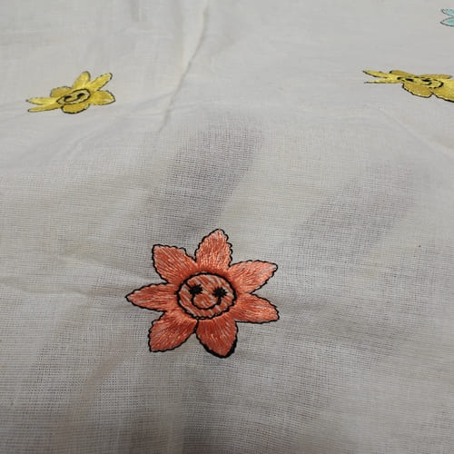 Dull White Embroidered Cotton Fabric with Multi Thread Embroidery and mirror work done all over the fabric. This Fabric is very Flowy and can be used to make trendy Dresses. Do Browse our other collections of Embroidered Fabrics