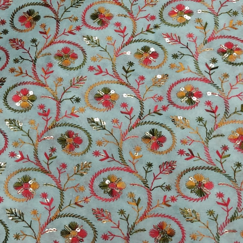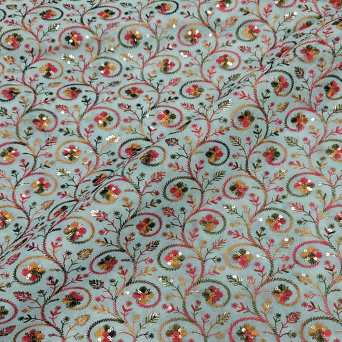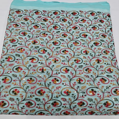 Light Blue Embroidered Georgette Fabric with Sequins and mirror work done all over the fabric. This Fabric is very Flowy and can be used to make trendy Dresses. Do Browse our other collections of Embroidered Fabrics