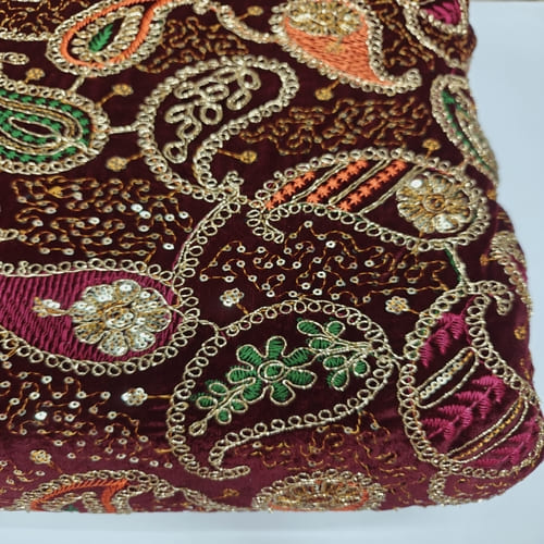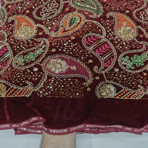 Maroon Embroidered Velvet Fabric with Multi Thread Embroidery and mirror work done all over the fabric. This Fabric is very Flowy and can be used to make trendy Dresses. Do Browse our other collections of Embroidered Fabrics