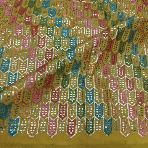 Mustard Embroidered Georgette Fabric with Multi Thread Embroidery and mirror work done all over the fabric. This Fabric is very Flowy and can be used to make trendy Dresses. Do Browse our other collections of Embroidered Fabrics