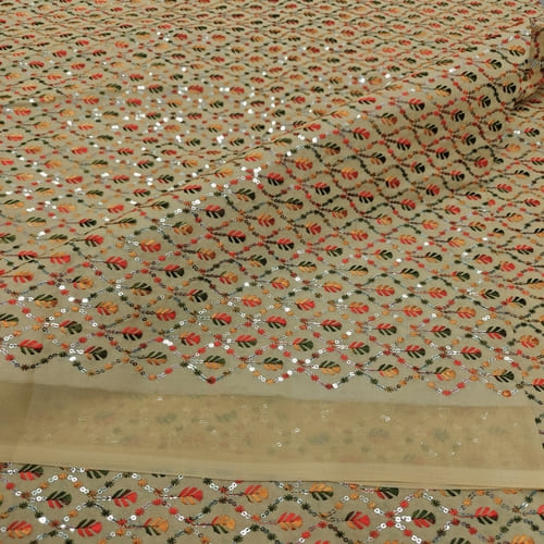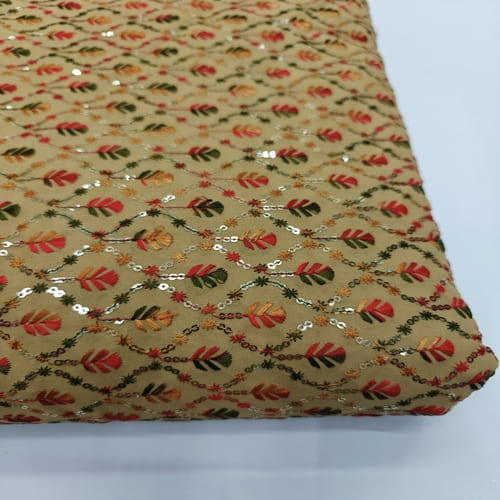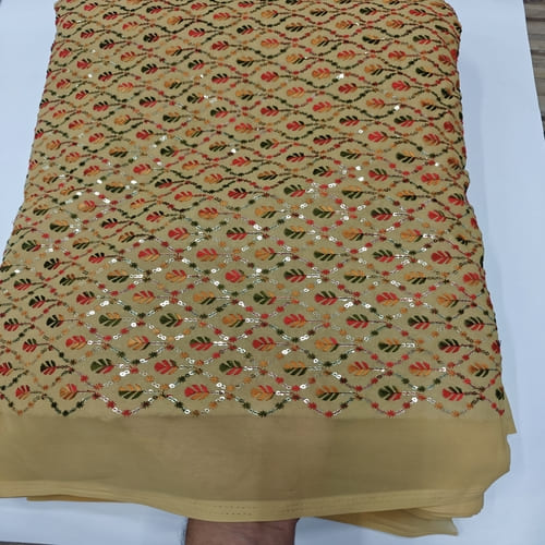 Mustard Embroidered Georgette Fabric with Multi Thread Embroidery and mirror work done all over the fabric. This Fabric is very Flowy and can be used to make trendy Dresses. Do Browse our other collections of Embroidered Fabrics