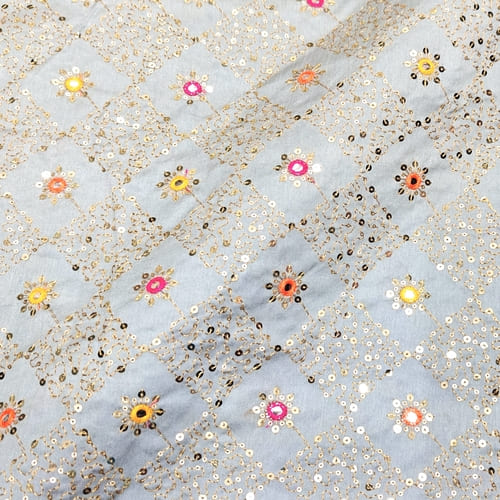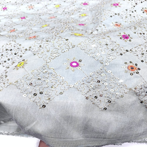 Pastel Embroidered Dupioni Fabric with Sequins and mirror work done all over the fabric. This Fabric is very Flowy and can be used to make trendy Dresses. Do Browse our other collections of Embroidered Fabrics