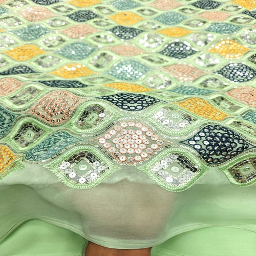 Pastel Green Embroidered Georgette Fabric with Multi Thread Embroidery and mirror work done all over the fabric. This Fabric is very Flowy and can be used to make trendy Dresses. Do Browse our other collections of Embroidered Fabrics