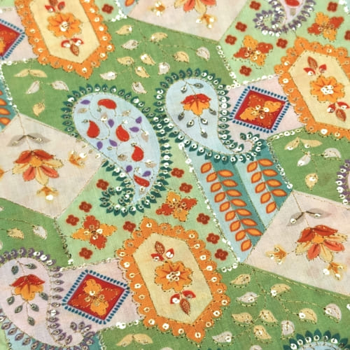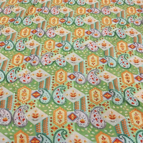 Position Print Embroidered Fabrics with Multi Thread Embroidery and mirror work done all over the fabric. This Fabric is very Flowy and can be used to make trendy Dresses. Do Browse our other collections of Embroidered Fabrics