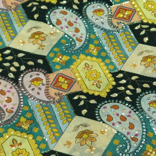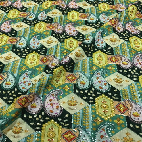 Position Print Embroidered Fabrics with Multi Thread Embroidery and mirror work done all over the fabric. This Fabric is very Flowy and can be used to make trendy Dresses. Do Browse our other collections of Embroidered Fabrics
