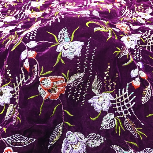 Purple Embroidered Velvet Fabric with Multi Thread Embroidery and mirror work done all over the fabric. This Fabric is very Flowy and can be used to make trendy Dresses. Do Browse our other collections of Embroidered Fabrics