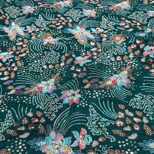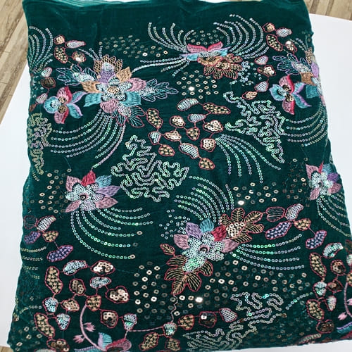 Rama Green Embroidered Velvet Fabric with Multi Thread Embroidery and mirror work done all over the fabric. This Fabric is very Flowy and can be used to make trendy Dresses. Do Browse our other collections of Embroidered Fabrics