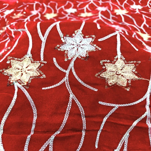 Red Embroidered Velvet Fabric with Multi Thread Embroidery and mirror work done all over the fabric. This Fabric is very Flowy and can be used to make trendy Dresses. Do Browse our other collections of Embroidered Fabrics