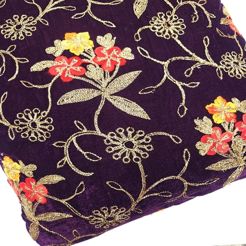 Wine Embroidered Velvet Fabric with Multi Thread Embroidery and mirror work done all over the fabric. This Fabric is very Flowy and can be used to make trendy Dresses. Do Browse our other collections of Embroidered Fabrics
